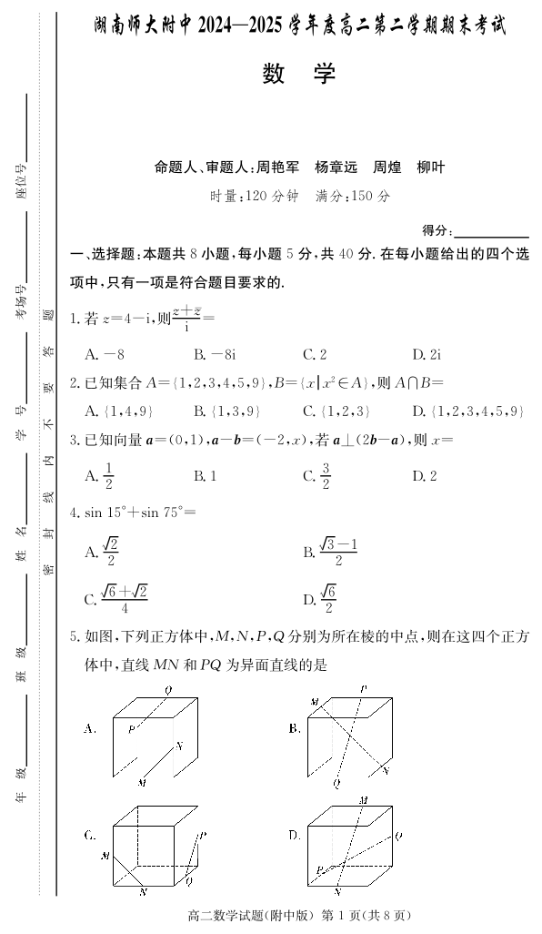 湖南省师范大学附属中学2024-2025学年高二下学期期末考试数学