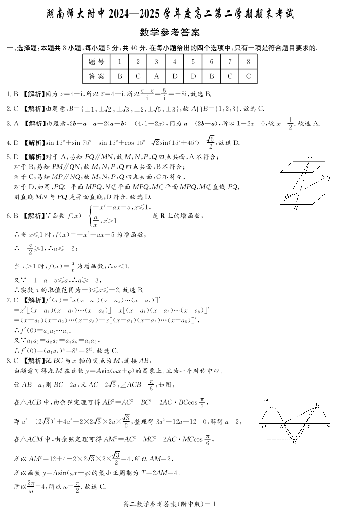 湖南省师范大学附属中学2024-2025学年高二下学期期末考试数学答案