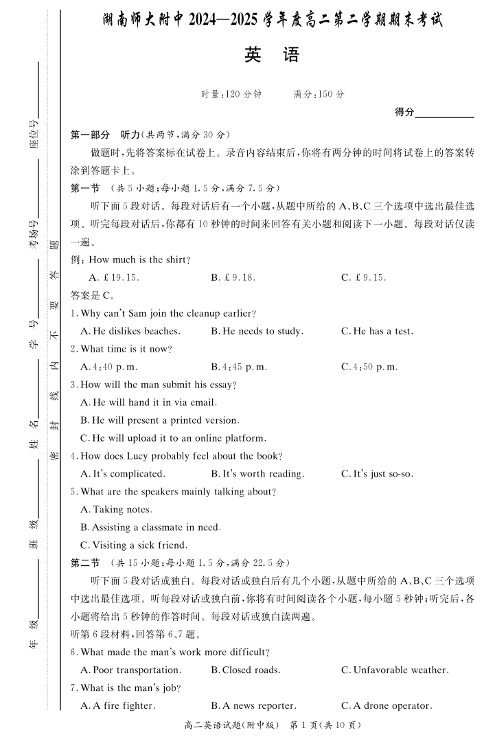 湖南省师范大学附属中学2024-2025学年高二下学期期末考试英语