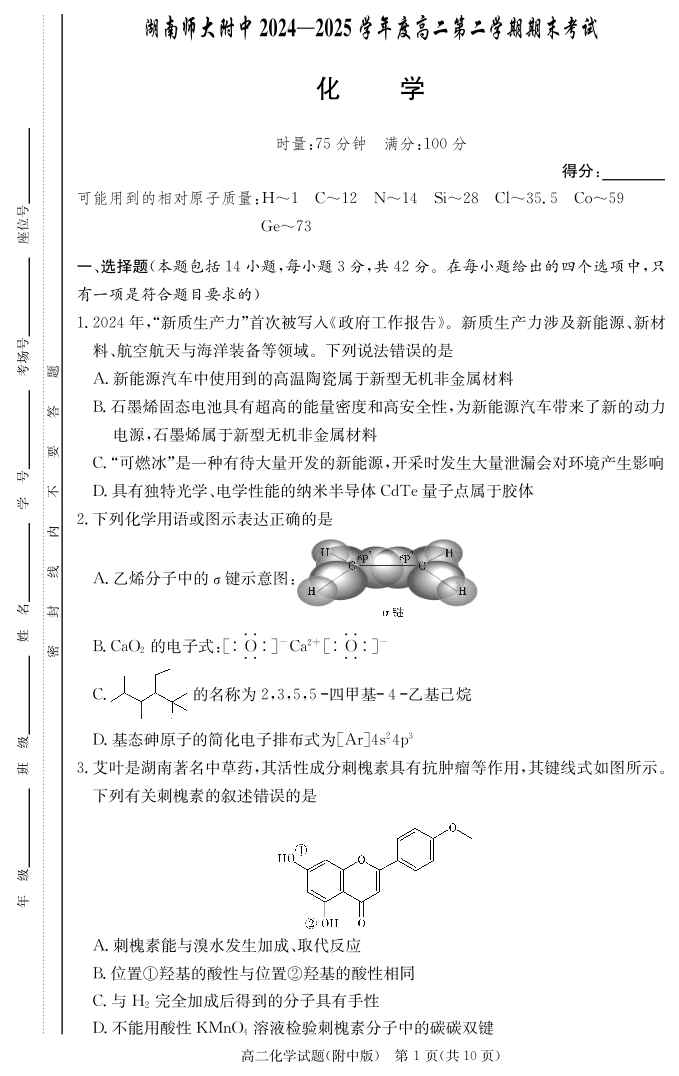 湖南省师范大学附属中学2024-2025学年高二下学期期末考试化学