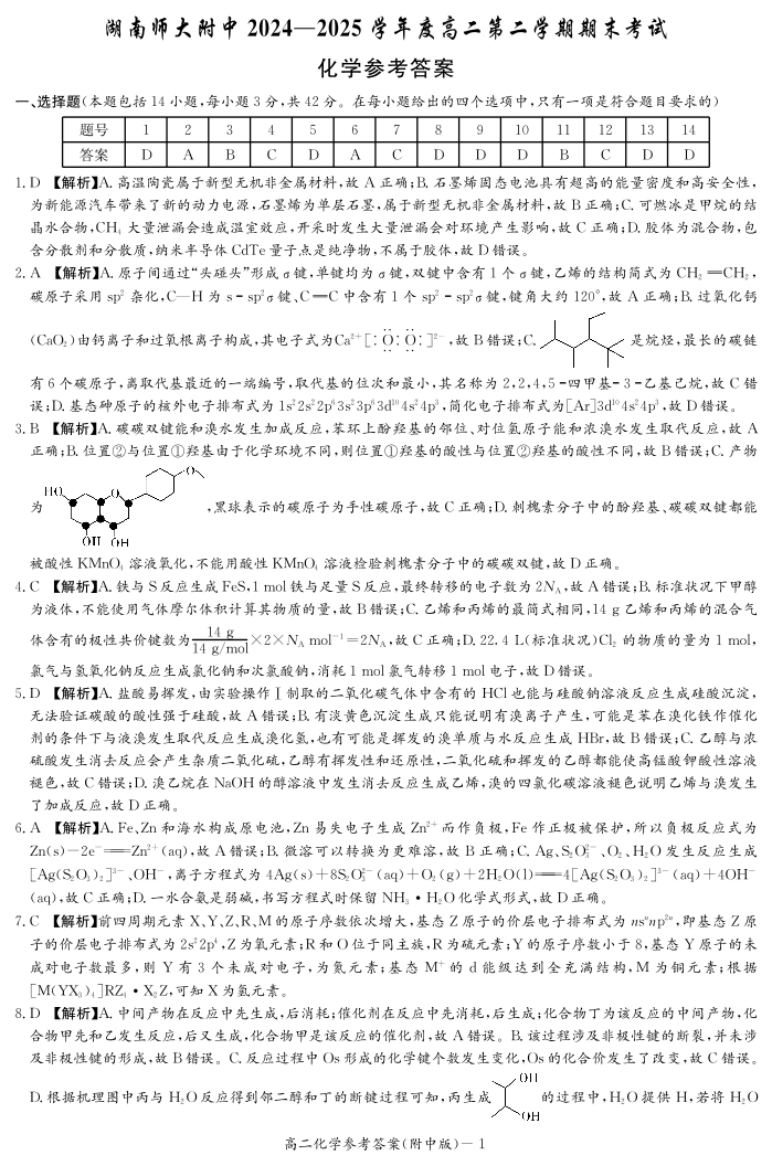 湖南省师范大学附属中学2024-2025学年高二下学期期末考试化学答案