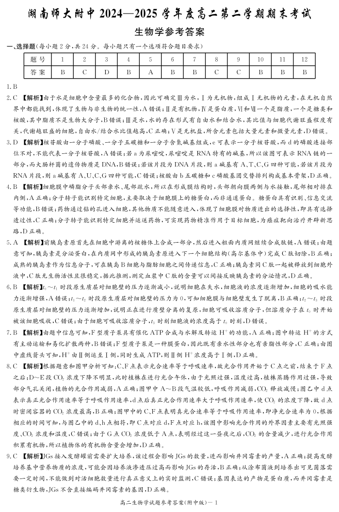 湖南省师范大学附属中学2024-2025学年高二下学期期末考试生物答案