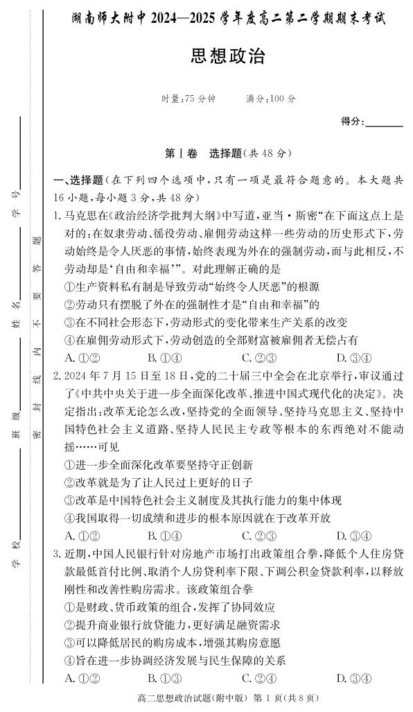 湖南省师范大学附属中学2024-2025学年高二下学期期末考试政治