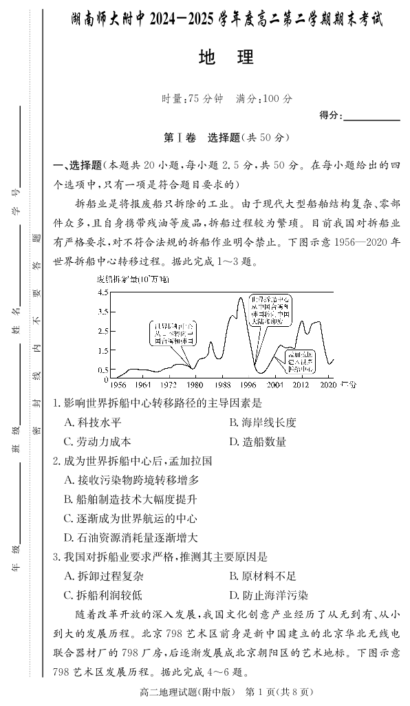 湖南省师范大学附属中学2024-2025学年高二下学期期末考试地理
