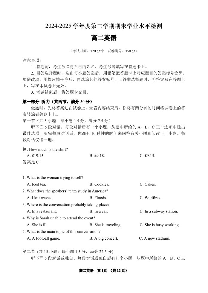 高二英语(山东省青岛区域2025.7高二期末检测)