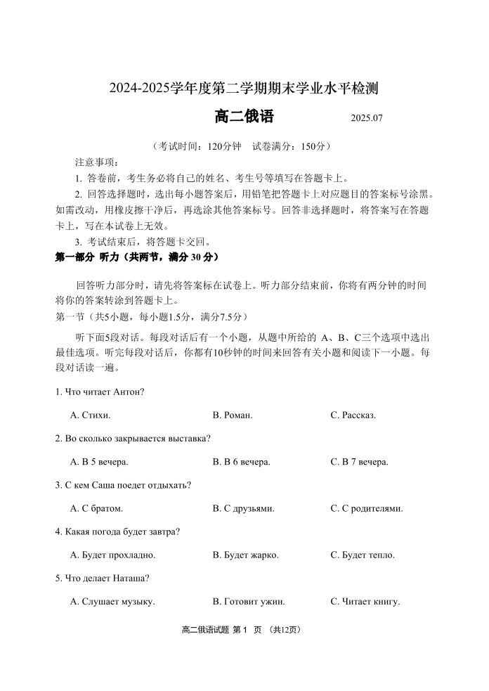 高二俄语(山东省青岛区域2025.7高二期末检测)
