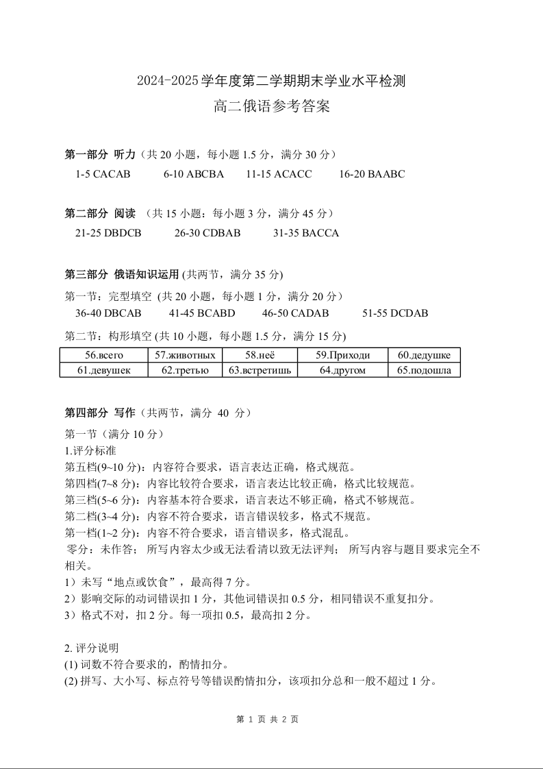 高二俄语答案(山东省青岛区域2025.7高二期末检测)