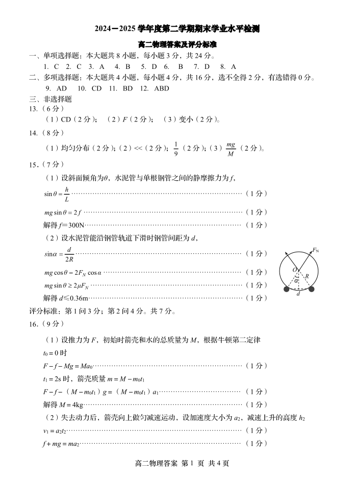 高二物理答案(山东省青岛区域2025.7高二期末检测)
