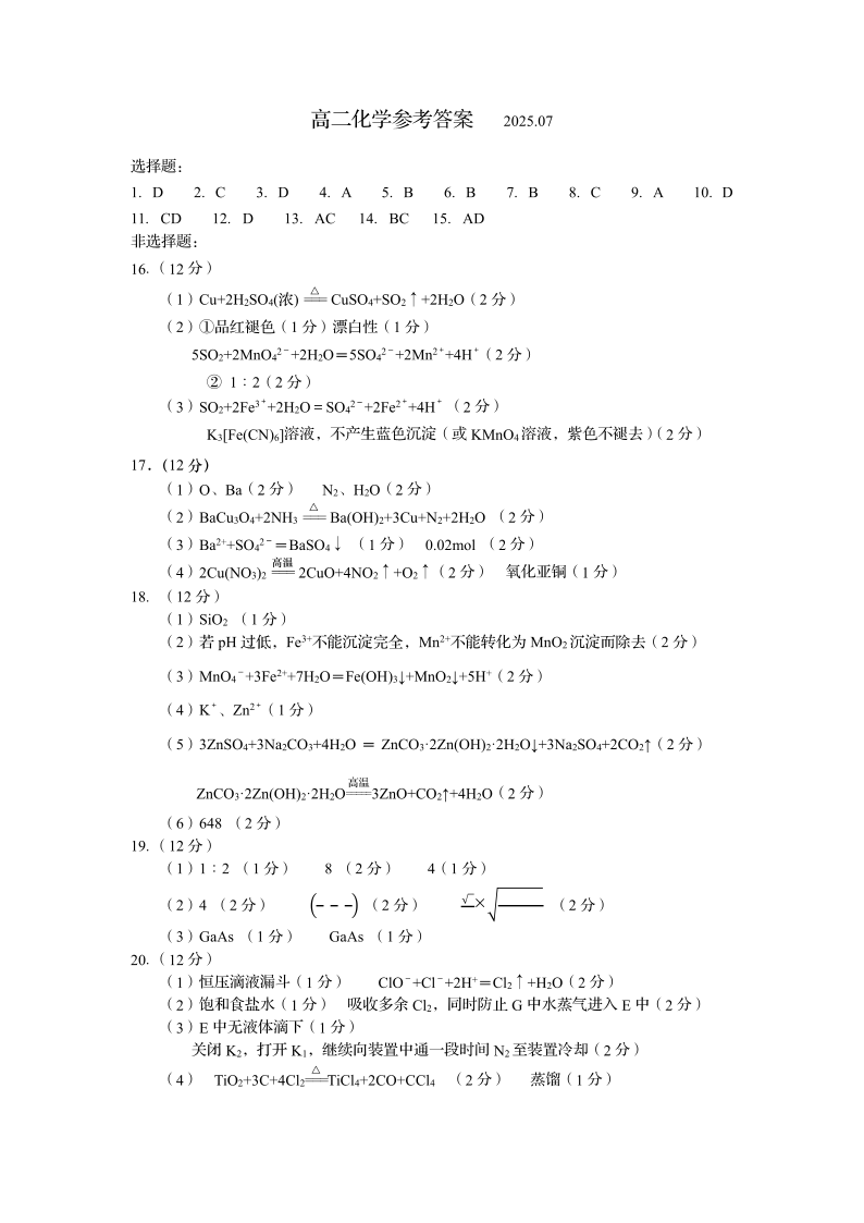 高二化学答案(山东省青岛区域2025.7高二期末检测)