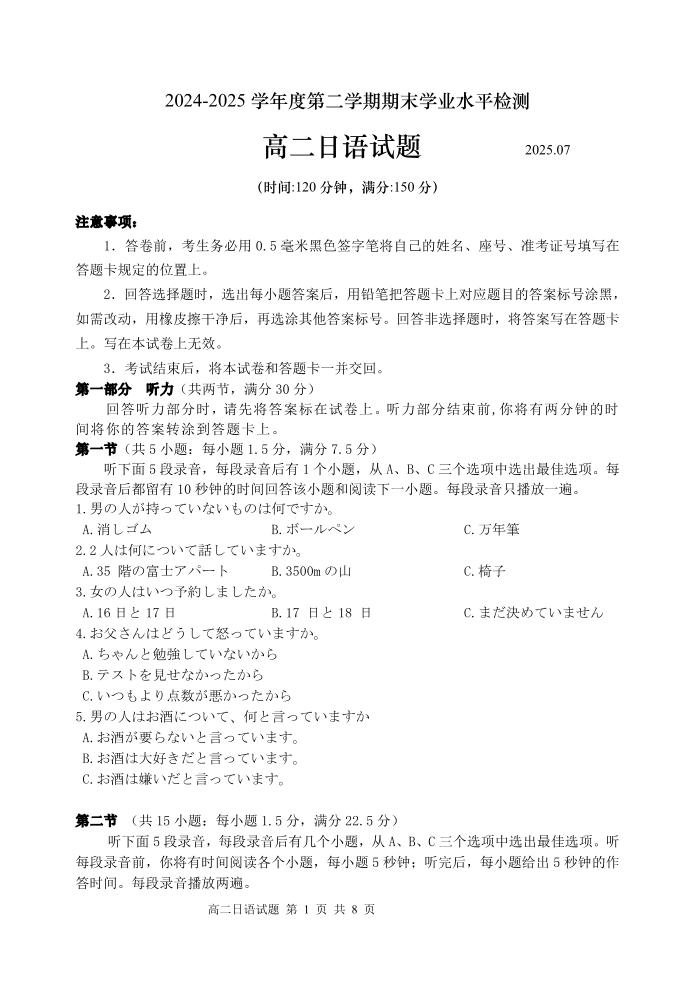高二日语(山东省青岛区域2025.7高二期末检测)
