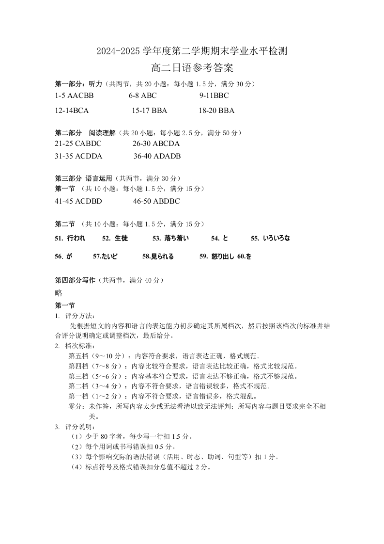 高二日语答案(山东省青岛区域2025.7高二期末检测)