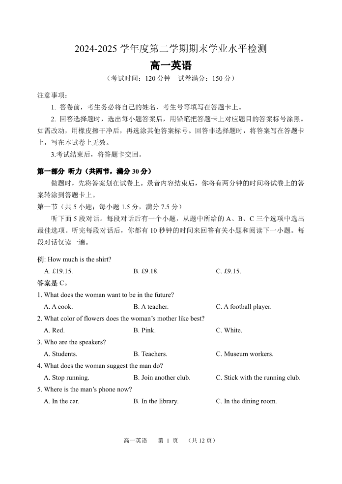 高一英语(山东省青岛区域2025.7高一期末检测)