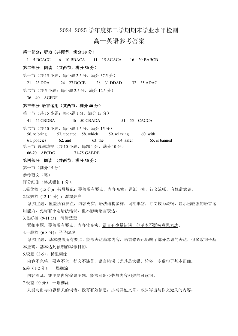 高一英语答案(山东省青岛区域2025.7高一期末检测)