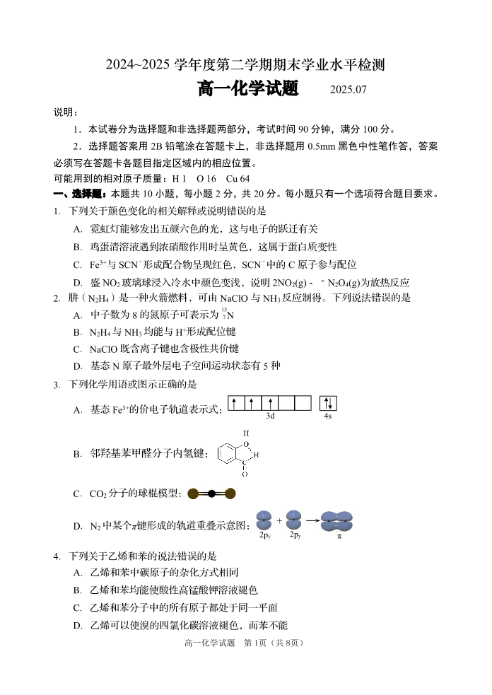 高一化学(山东省青岛区域2025.7高一期末检测)
