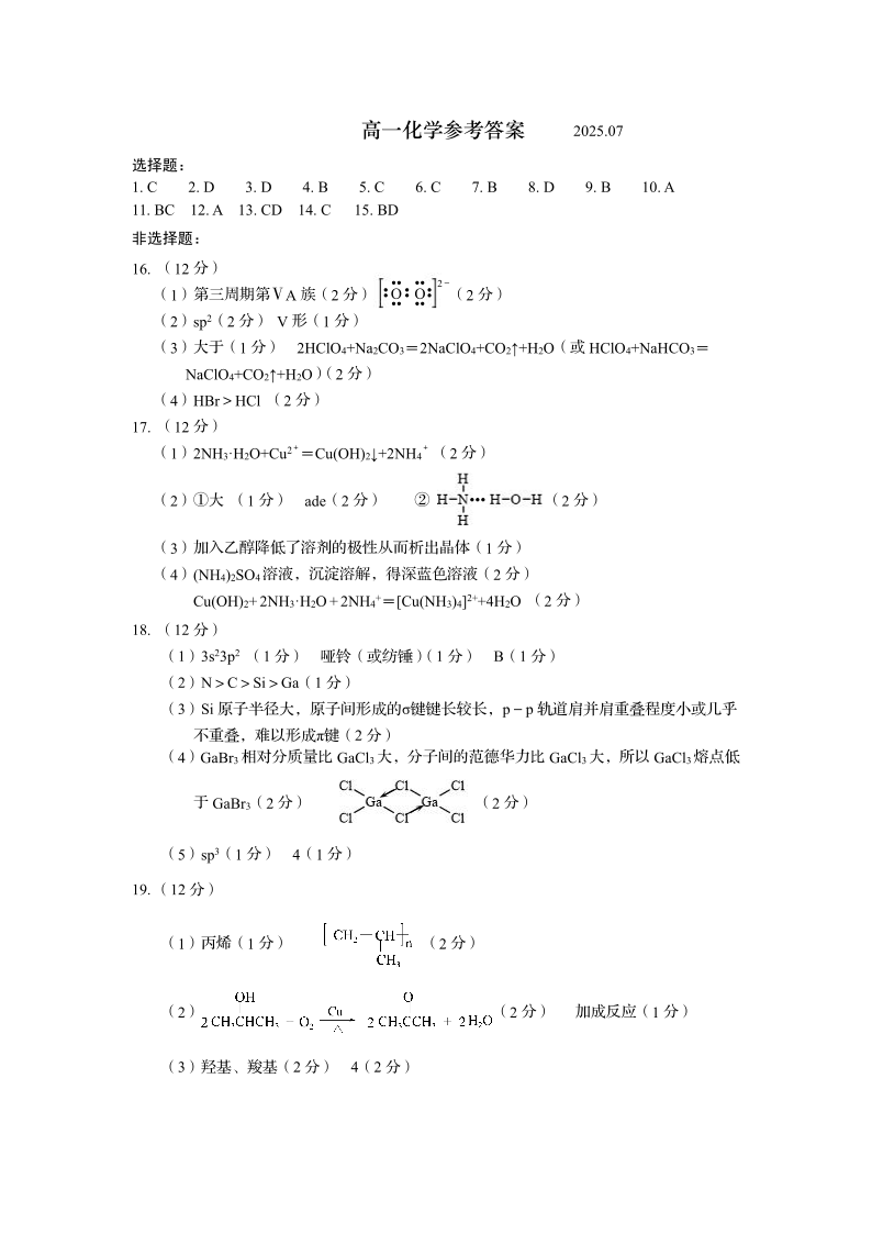 高一化学答案(山东省青岛区域2025.7高一期末检测)