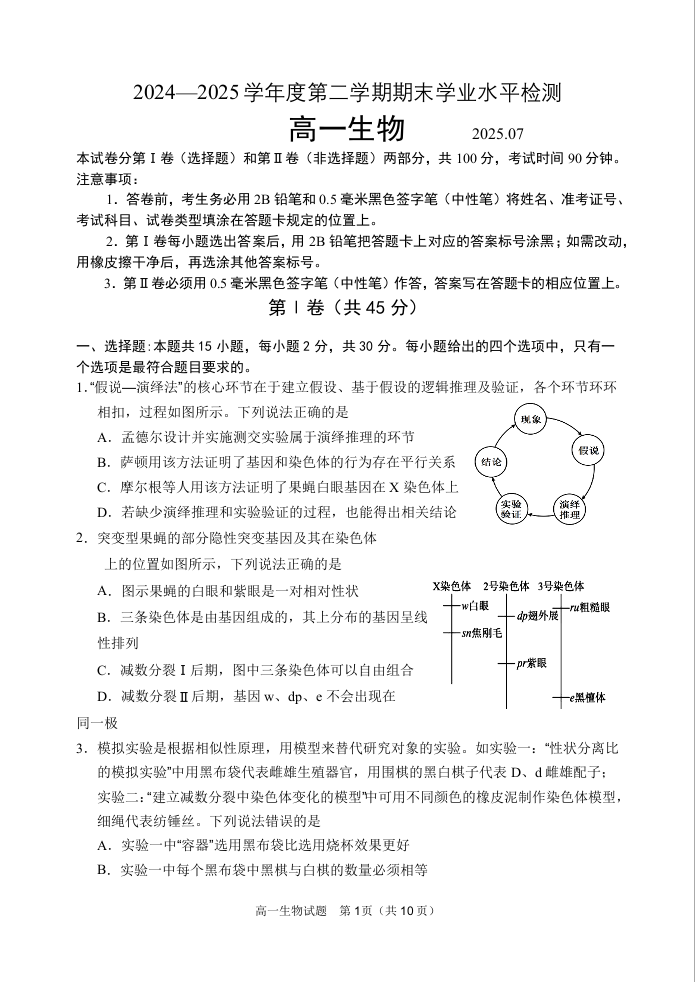 高一生物(山东省青岛区域2025.7高一期末检测)