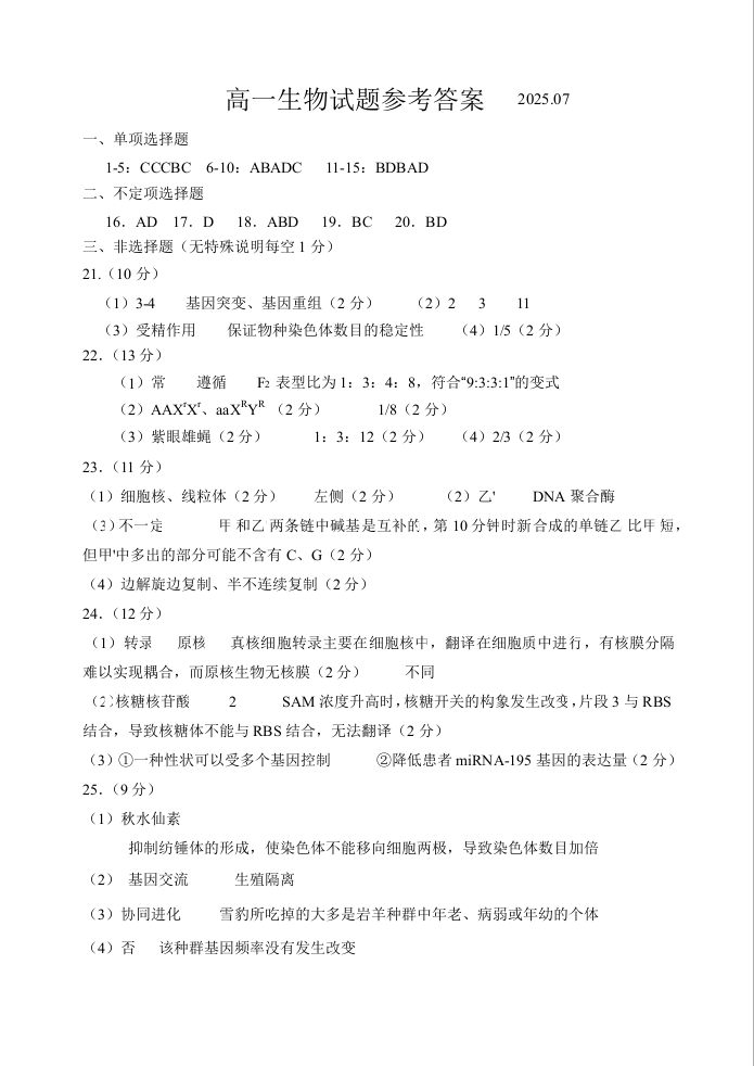 高一生物答案(山东省青岛区域2025.7高一期末检测)