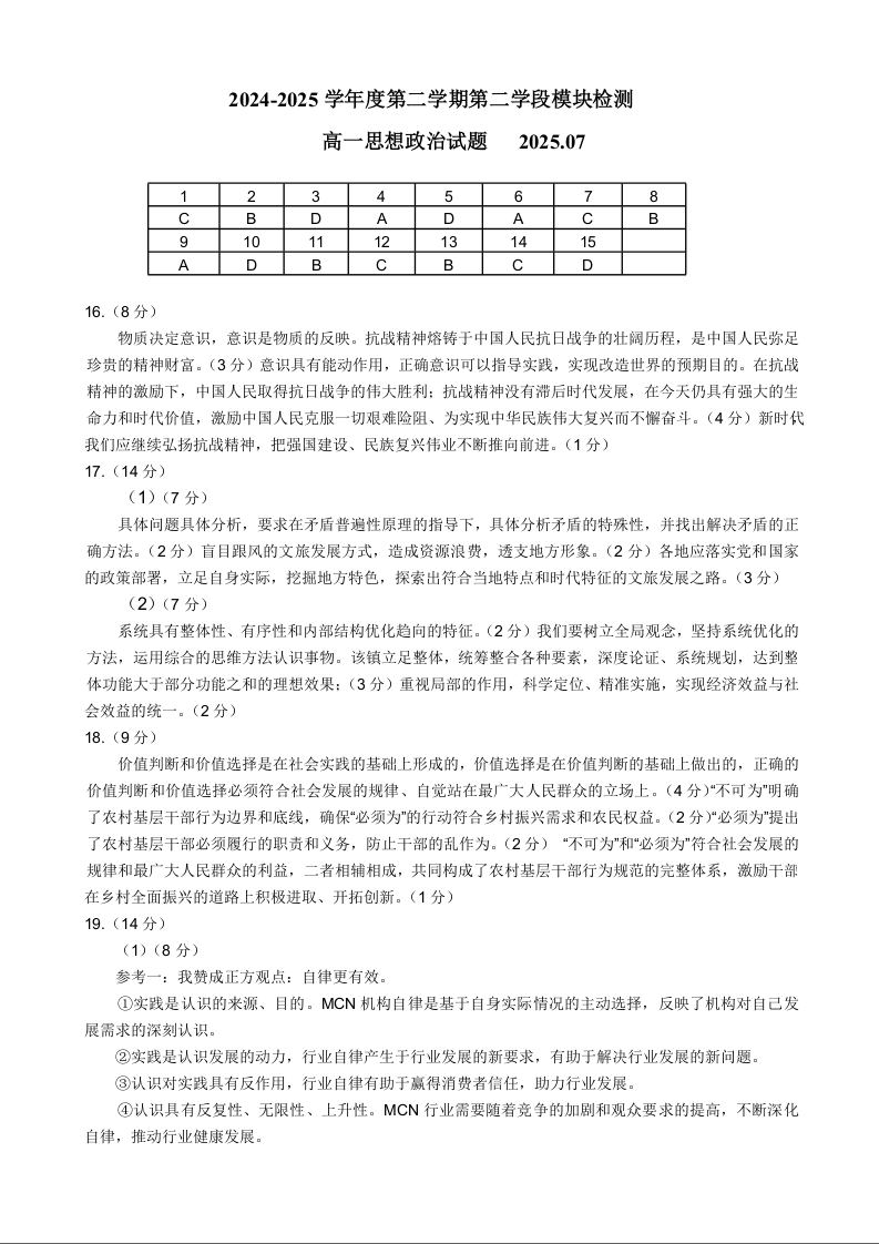 高一政治答案(山东省青岛区域2025.7高一期末检测)