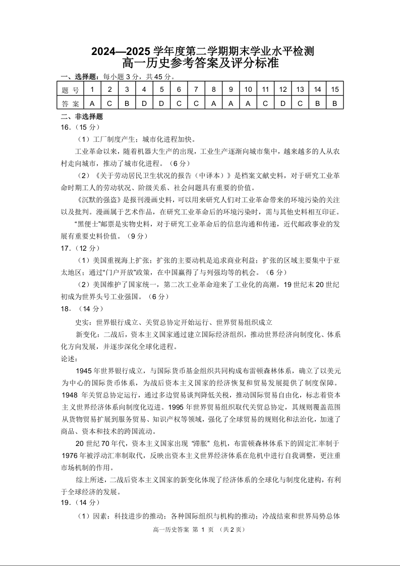 高一历史答案(山东省青岛区域2025.7高一期末检测)