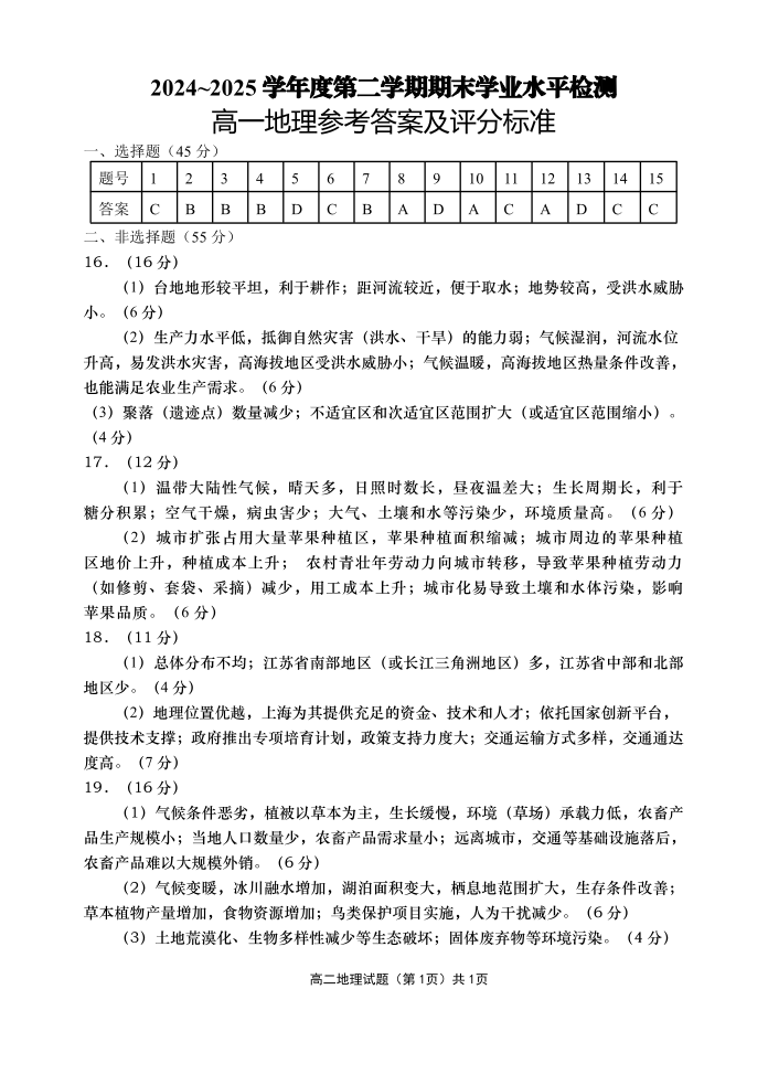 高一地理答案(山东省青岛区域2025.7高一期末检测)