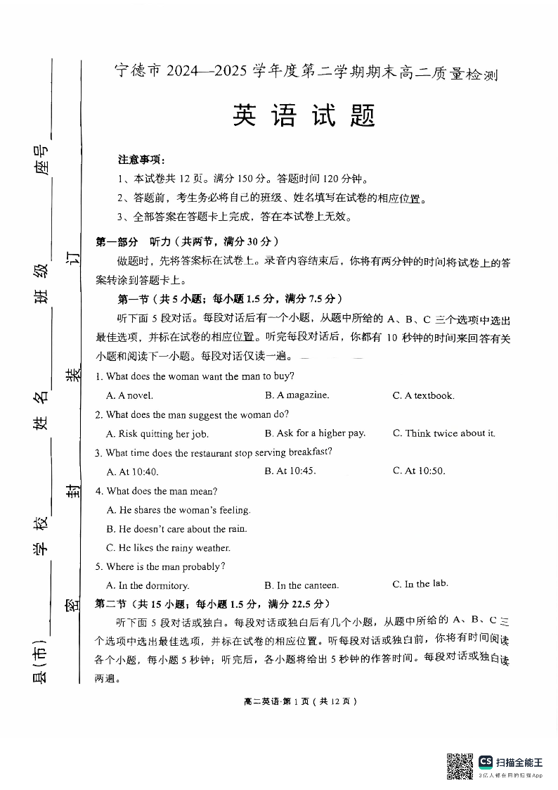 福建省宁德市2024-2025学年高二下学期6月期末考试英语