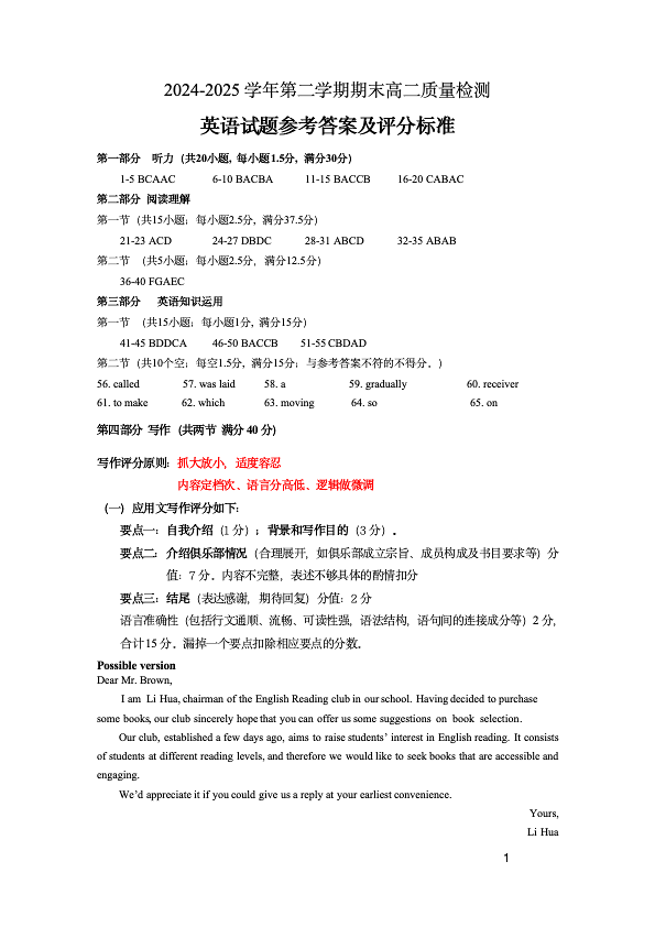 福建省宁德市2024-2025学年高二下学期6月期末考试英语答案