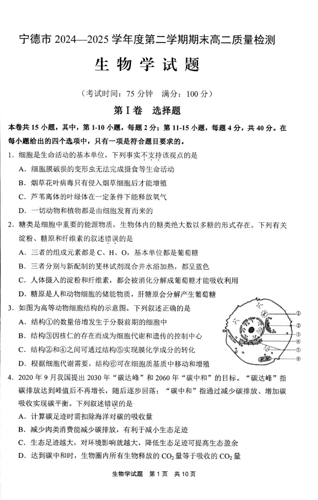 福建省宁德市2024-2025学年高二下学期6月期末考试生物+答案