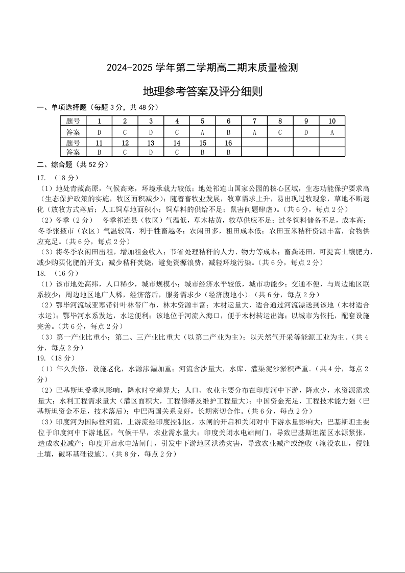 福建省宁德市2024-2025学年高二下学期6月期末考试地理答案