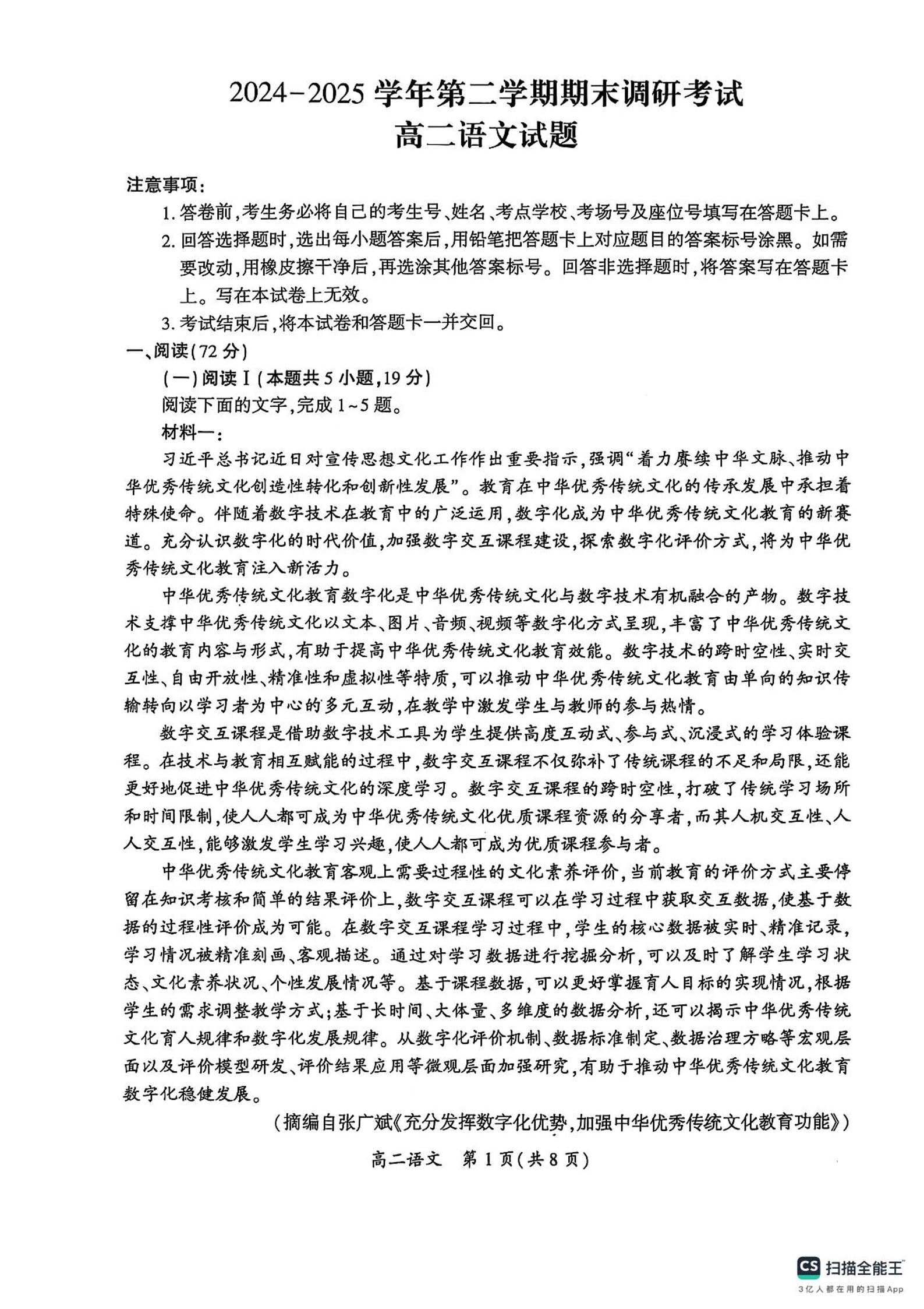 河南省开封市2024-2025学年高二下学期期末调研考试语文