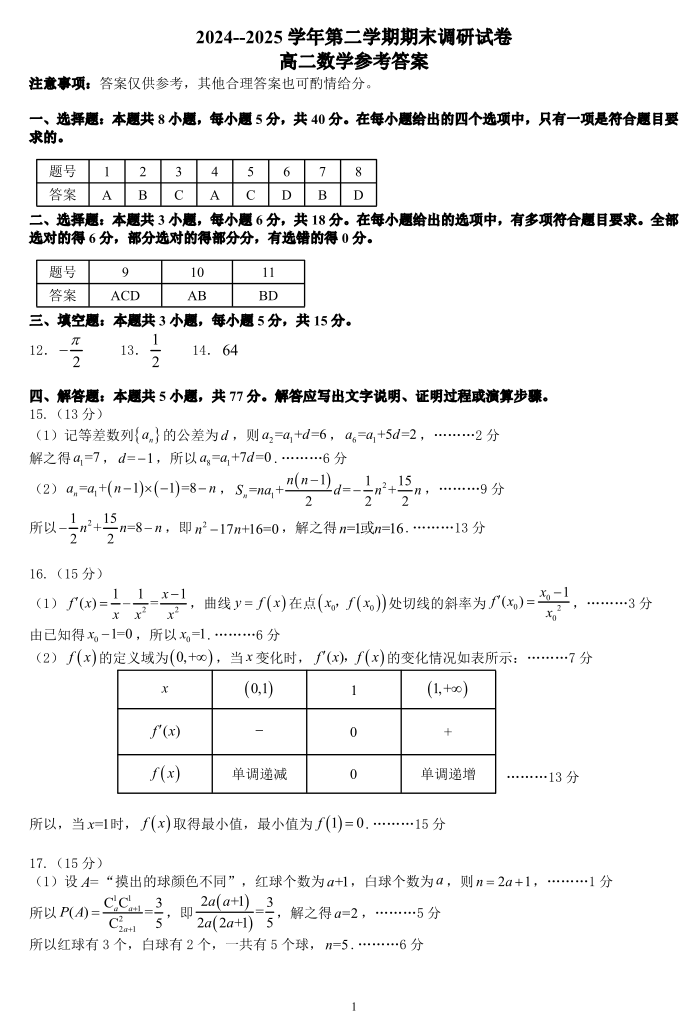 河南省开封市2024-2025学年高二下学期期末调研考试数学答案