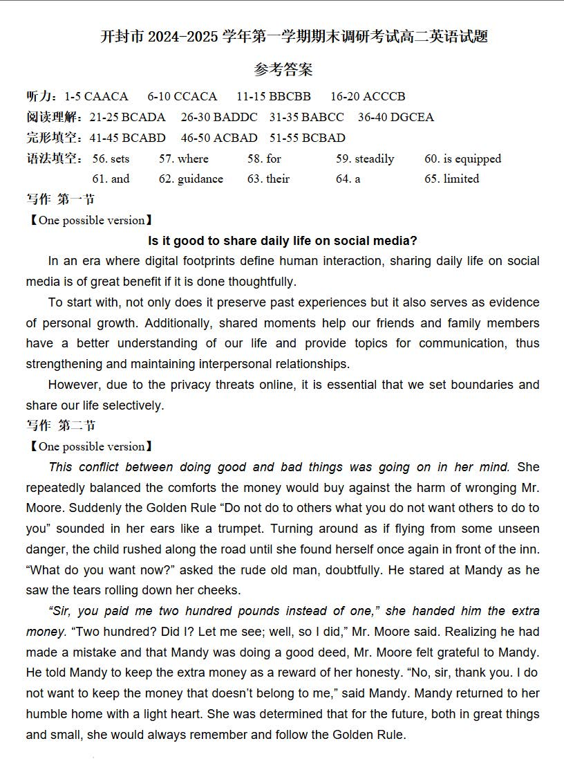 河南省开封市2024-2025学年高二下学期期末调研考试英语答案