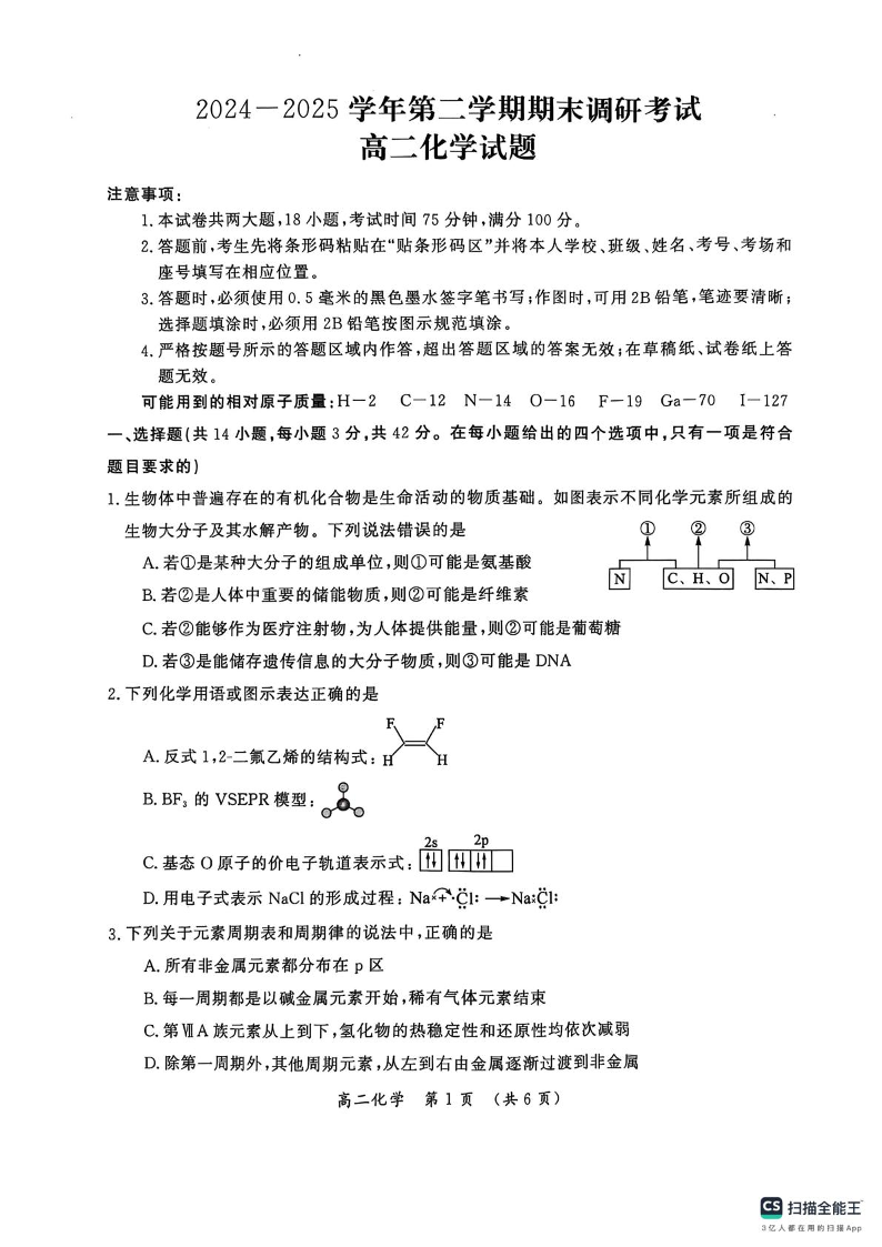 河南省开封市2024-2025学年高二下学期期末调研考试化学+答案