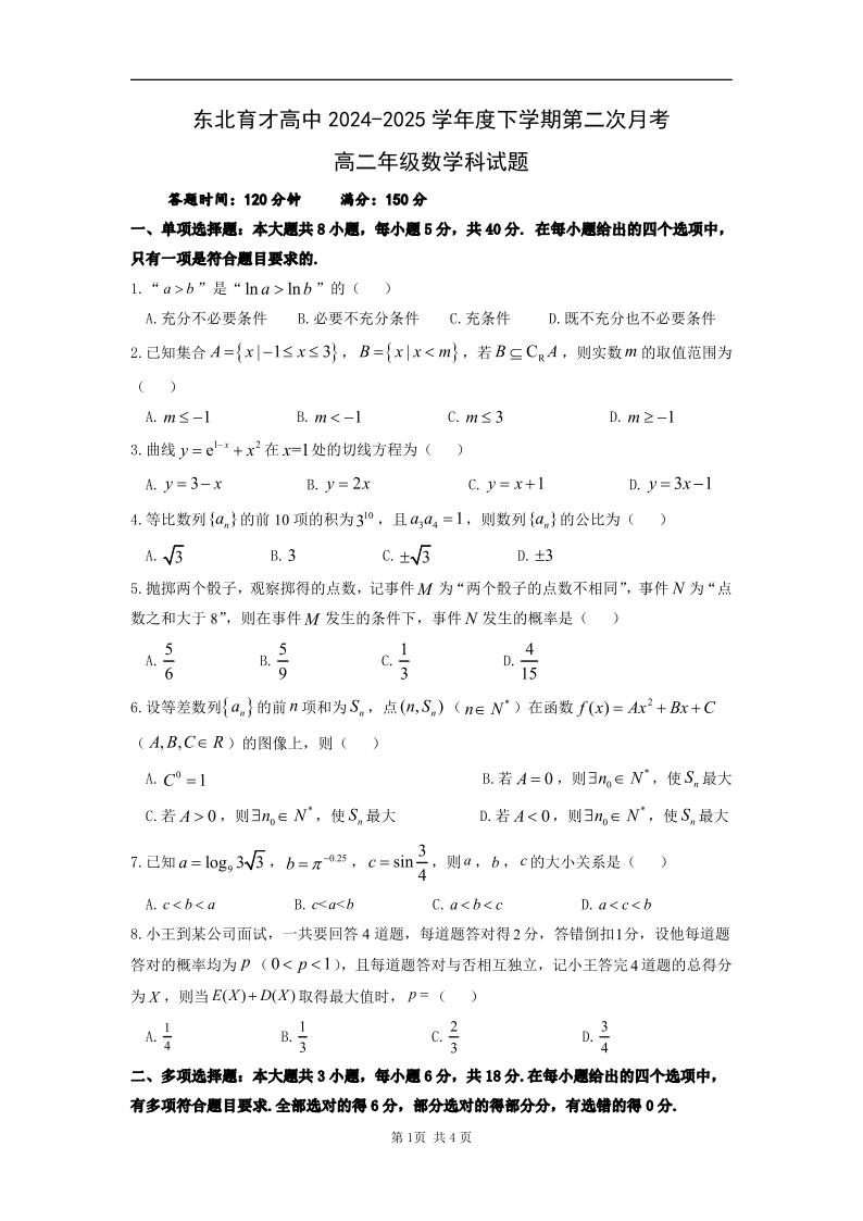 辽宁省沈阳市东北育才学校2024-2025学年高二下学期第二次月考数学+答案
