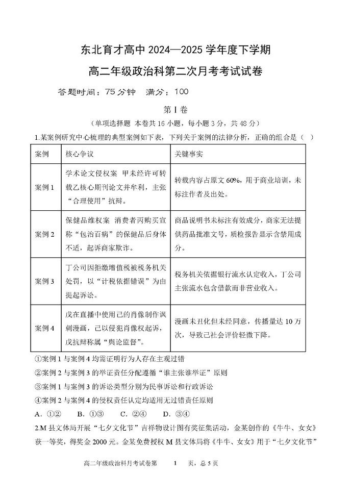 辽宁省沈阳市东北育才学校2024-2025学年高二下学期第二次月考政治+答案