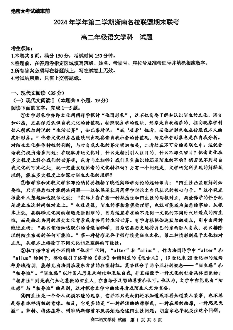 浙江省温州市浙南名校2024-2025学年高二下学期6月期末考试语文+答案