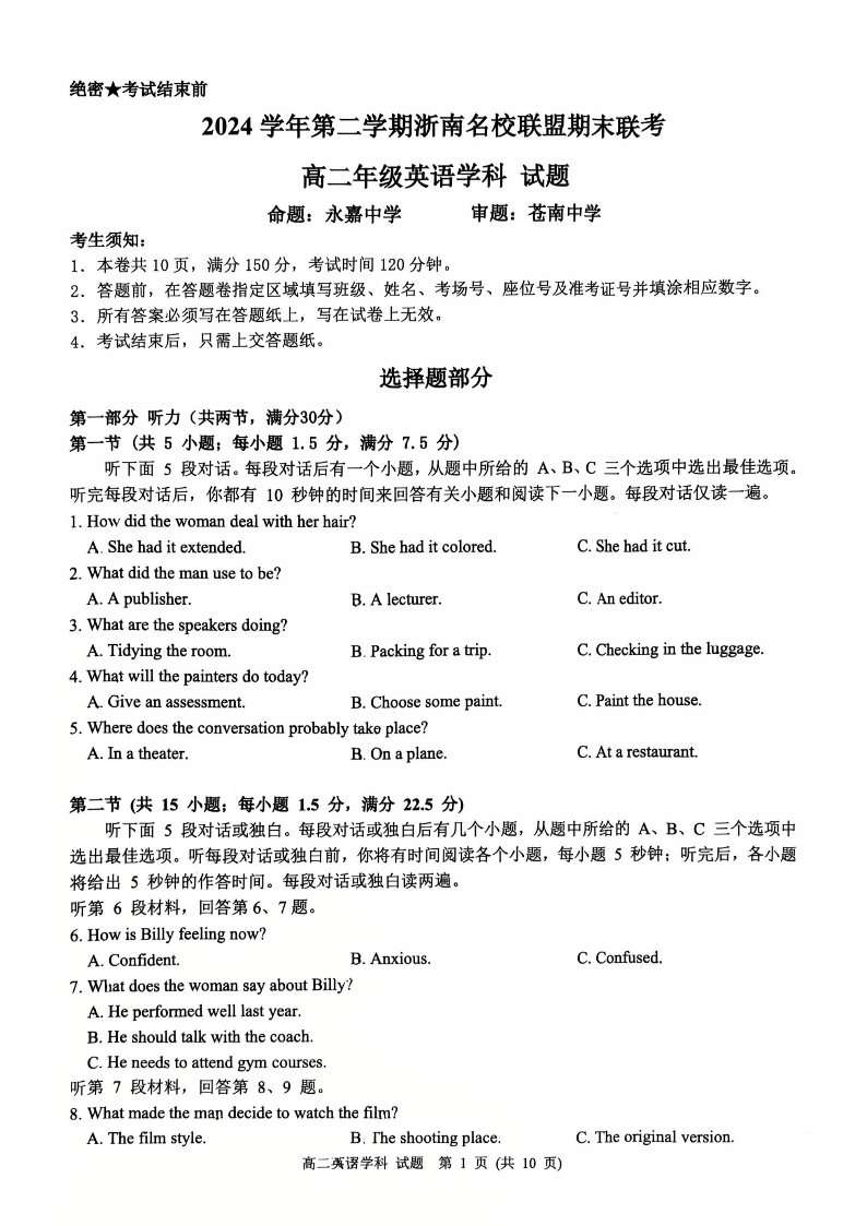 浙江省温州市浙南名校2024-2025学年高二下学期6月期末考试英语+答案