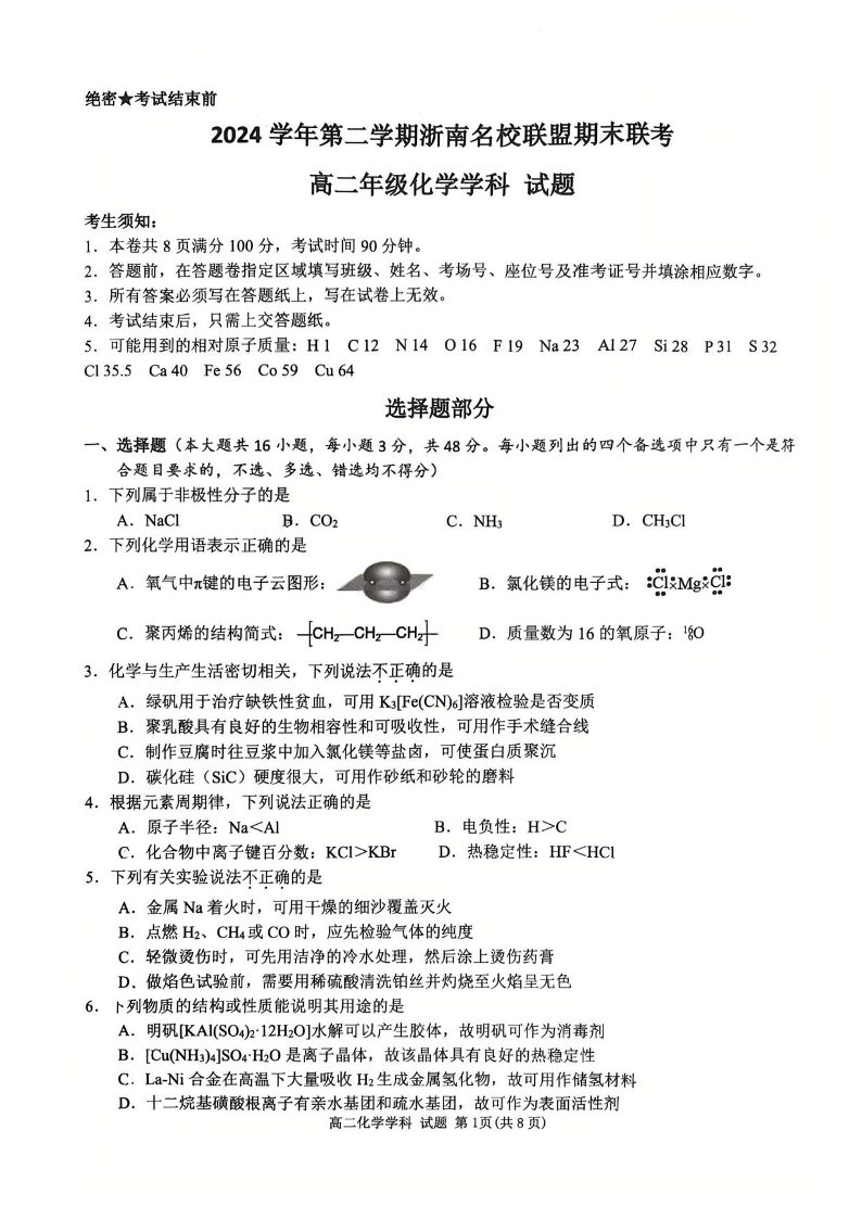 浙江省温州市浙南名校2024-2025学年高二下学期6月期末考试化学+答案