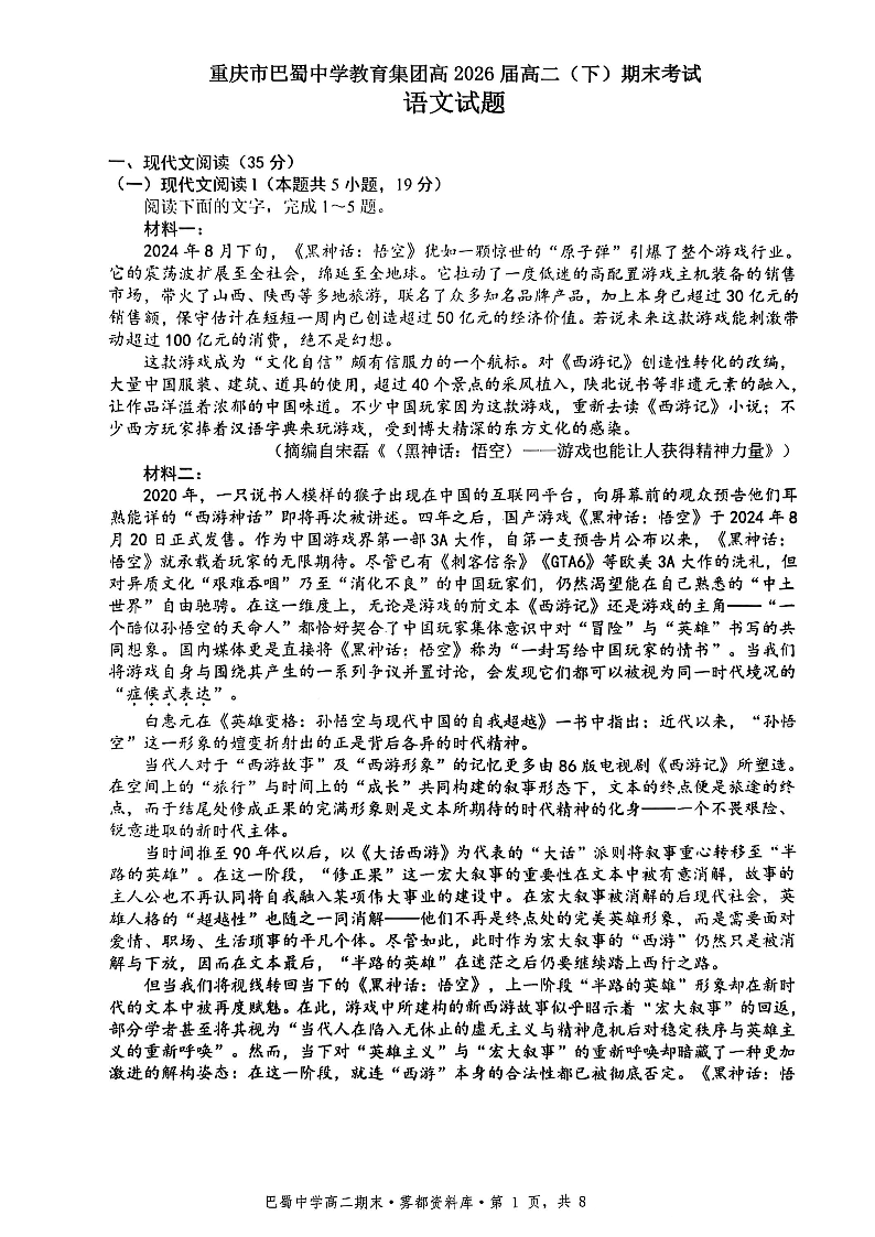 重庆市巴蜀中学教育集团2026届高二下学期末考试语文+答案