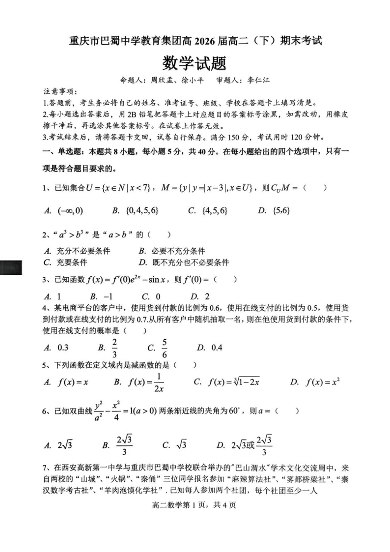 重庆市巴蜀中学教育集团2026届高二下学期末考试数学