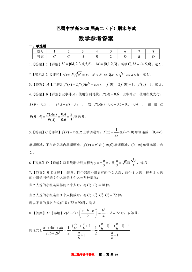 重庆市巴蜀中学教育集团2026届高二下学期末考试数学答案