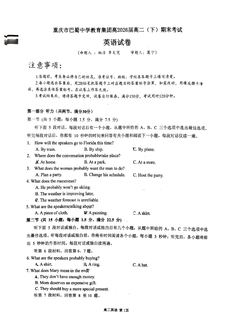 重庆市巴蜀中学教育集团2026届高二下学期末考试英语