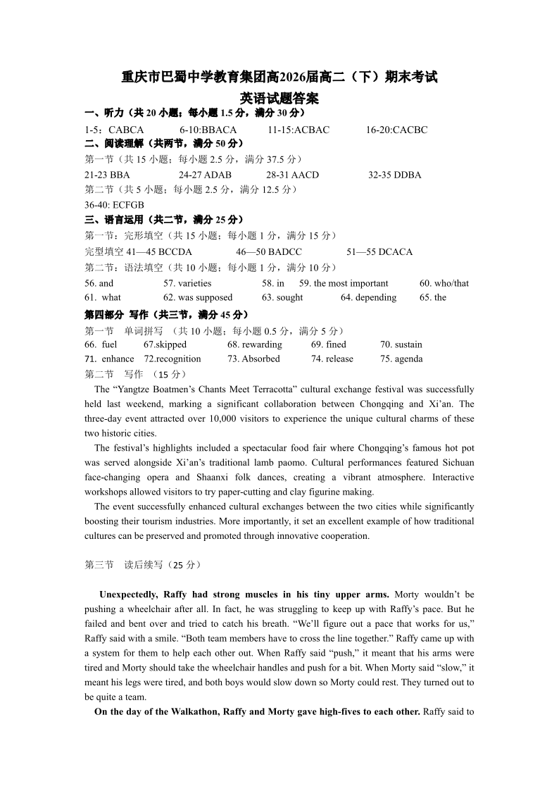 重庆市巴蜀中学教育集团2026届高二下学期末考试英语答案