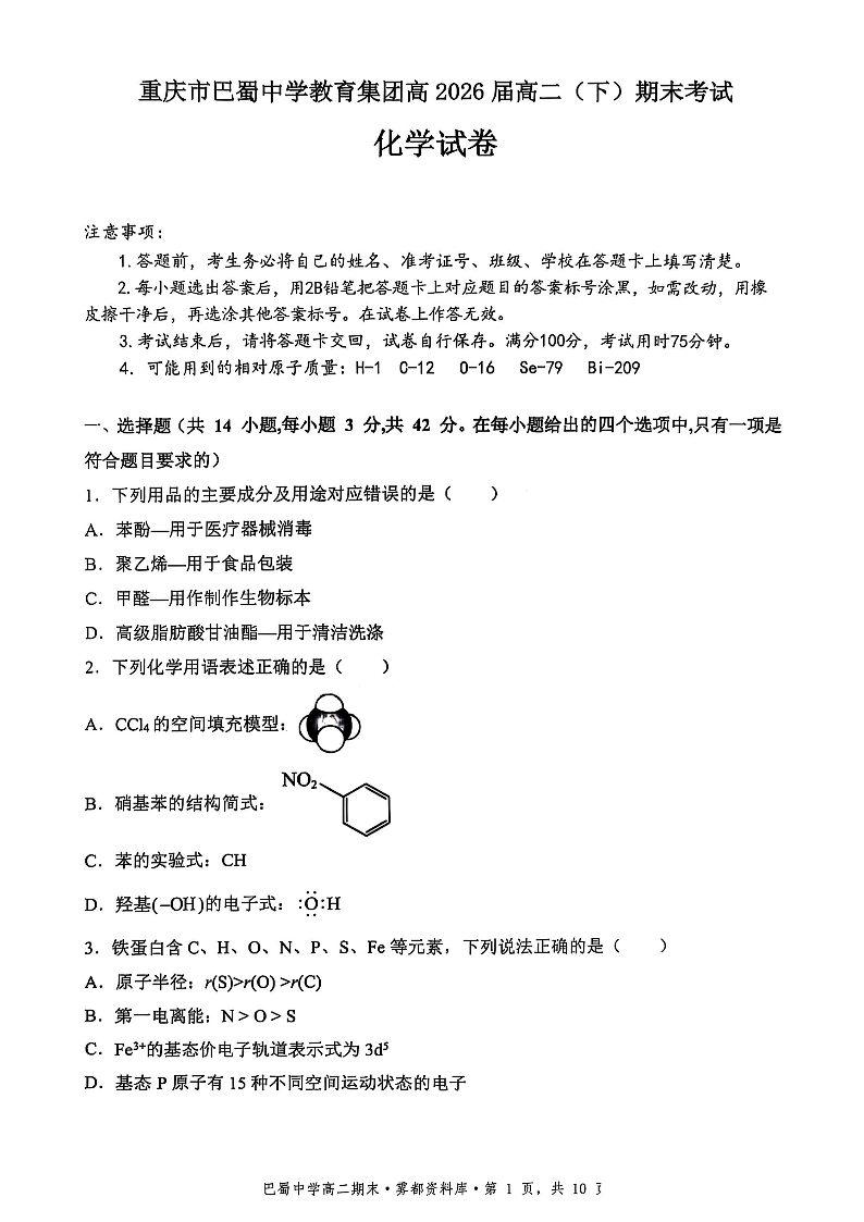 重庆市巴蜀中学教育集团2026届高二下学期末考试化学+答案