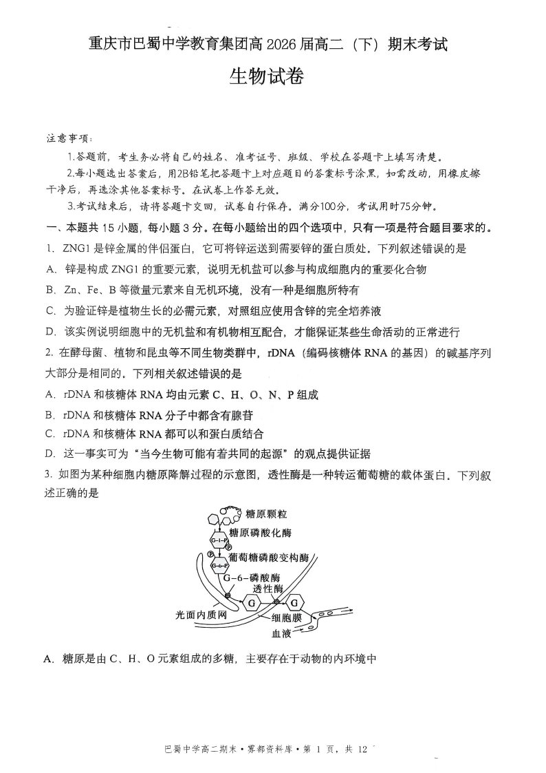 重庆市巴蜀中学教育集团2026届高二下学期末考试生物+答案