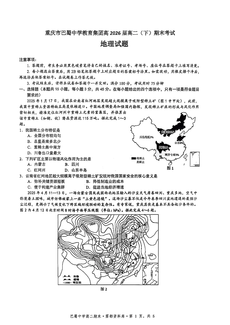 重庆市巴蜀中学教育集团2026届高二下学期末考试地理+答案
