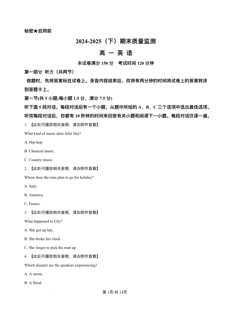辽宁省沈文新高考研究联盟2024-2025学年高一下学期7月期末考试英语+答案
