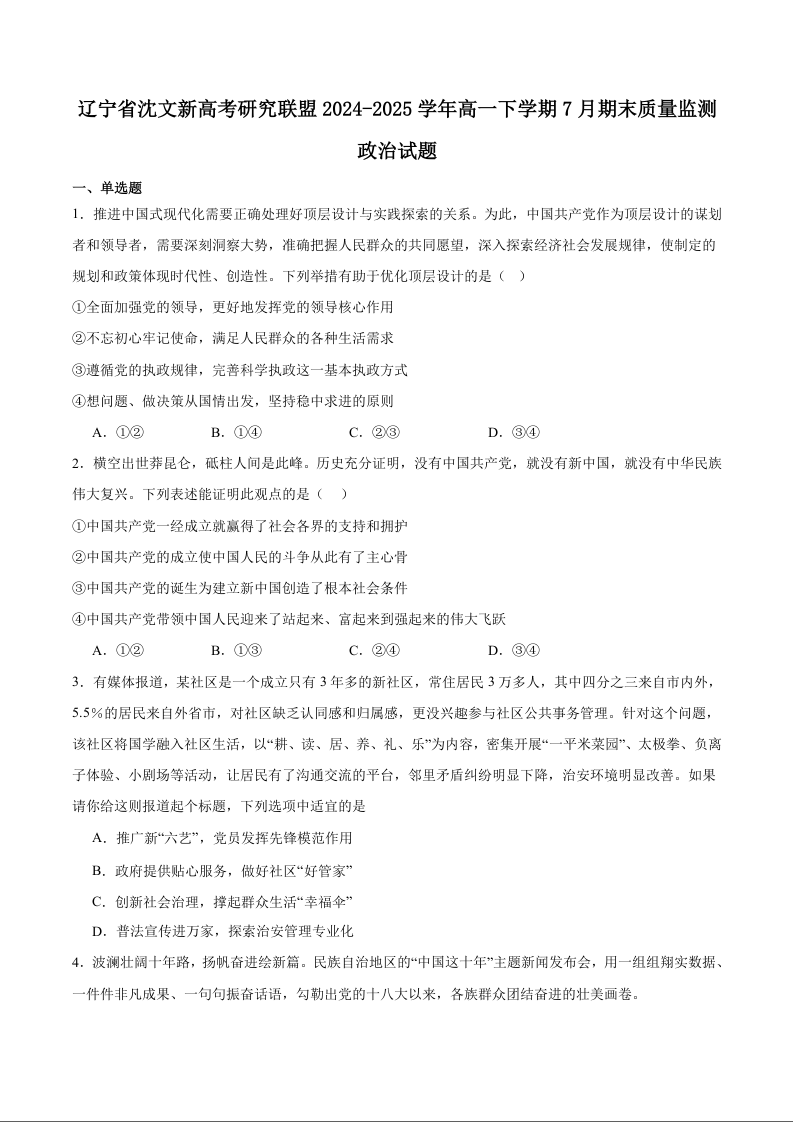 辽宁省沈文新高考研究联盟2024-2025学年高一下学期7月期末考试政治+答案