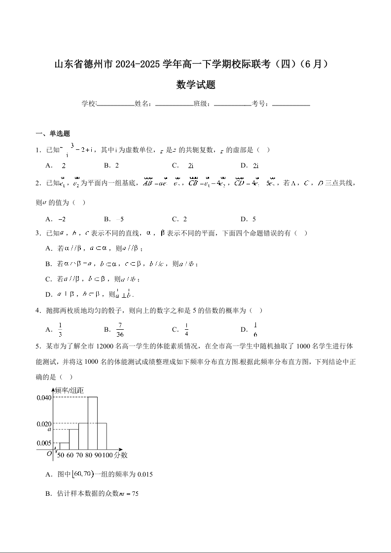 山东省德州市2024-2025学年高一下学期6月校际联考(四) 数学+答案
