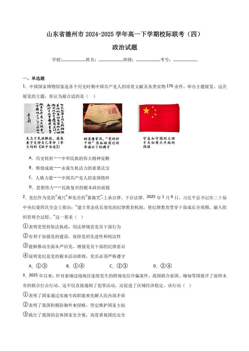 山东省德州市2024-2025学年高一下学期6月校际联考(四) 政治+答案