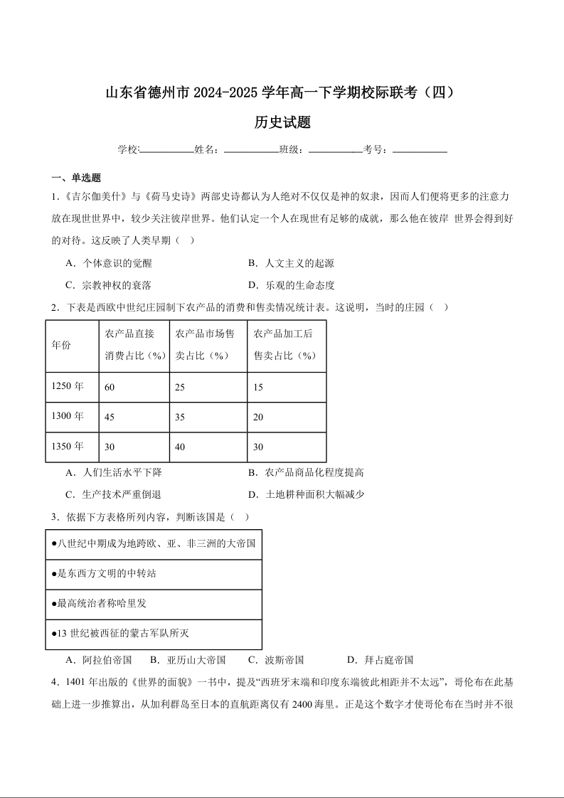 山东省德州市2024-2025学年高一下学期6月校际联考(四)历史+答案